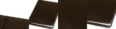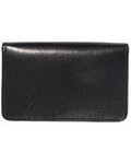 - Holds ID/business card behind clear PVC viewing window on back panel hidden by leather flap